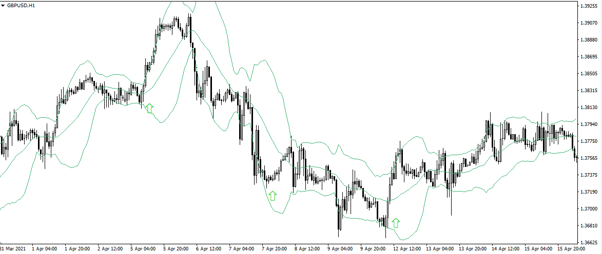 In this case, a signal to open a long position can be a rebound from the lower border of the Bollinger Bands indicator. The price reaching the upper border of this indicator can serve as a signal to close a position. In this case, a hedging sell trade can be opened when the lower boundary of the Bollinger Band indicator is broken.